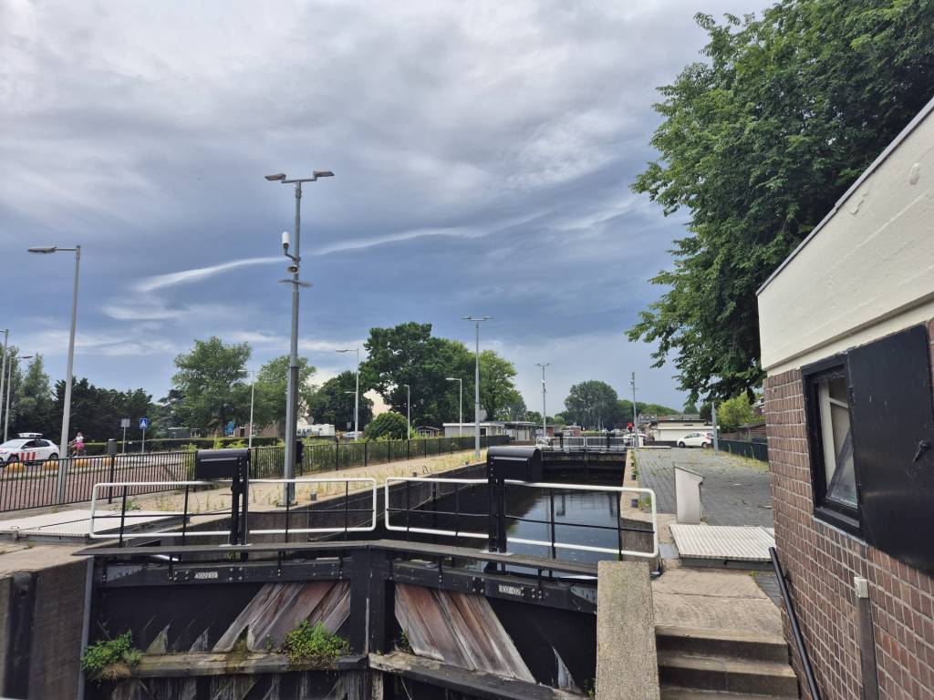 Terwijl ik de sluis bedien, zie ik de lucht boven me donkerder worden. In de verte hoor ik gerommel, maar bij deze sluis weet je nooit of het onweer is of gewoon een vliegtuig van Schiphol dat vertrekt. Dan zie ik ineens een flits. Aha — toch echt onweer.
