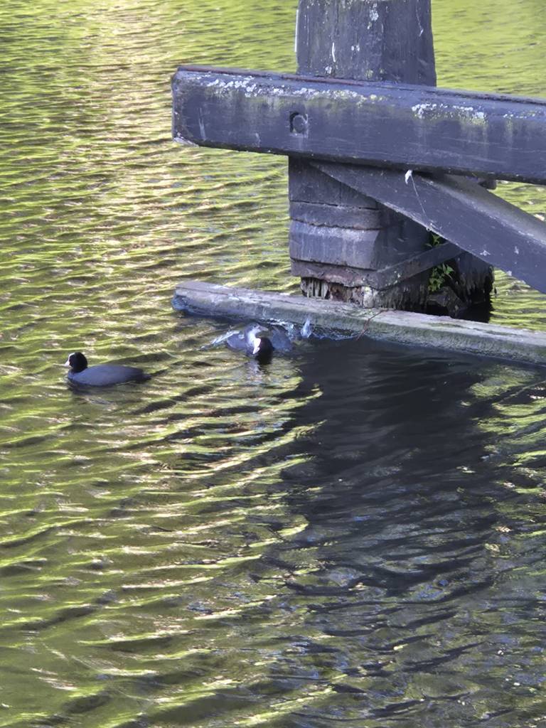 Voordat ik vertrek, neem ik nog even afscheid van mijn dagelijkse gezelschap: een meerkoetstelletje met hun kleintje.