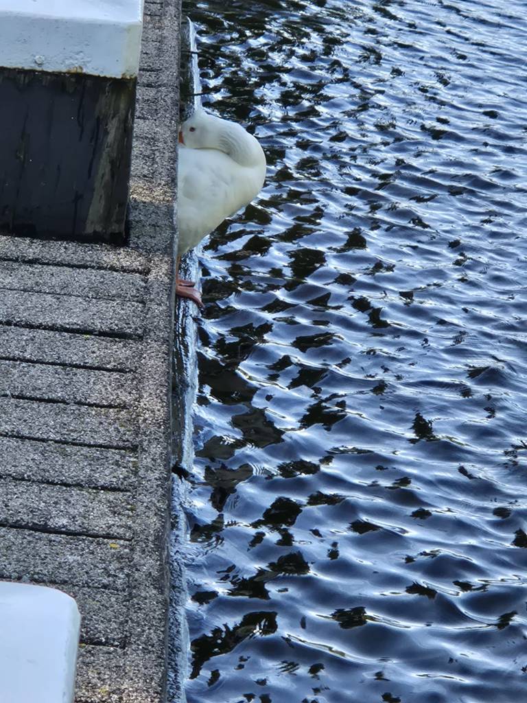 En onder de steiger ligt een gans zo ontspannen te slapen als ik er stilletjes langsloop.