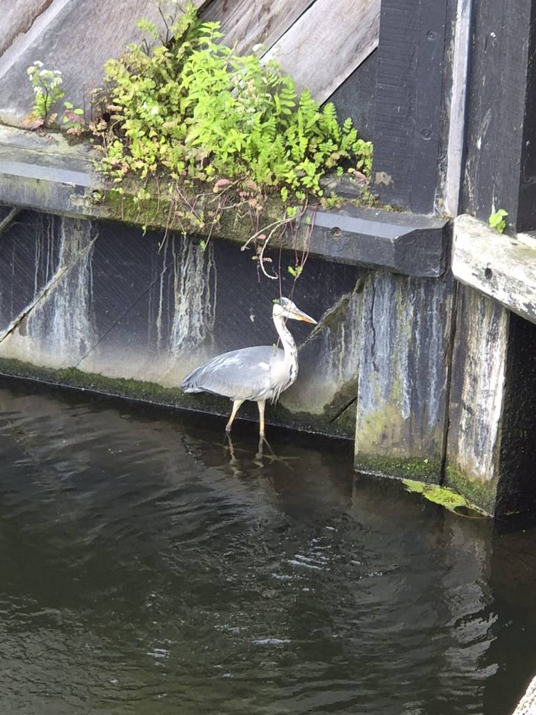 Ik kijk over de sluis heen en zie een bootje aan komen varen. Ik pak mijn sleutel en de paraplu, voor de zekerheid.